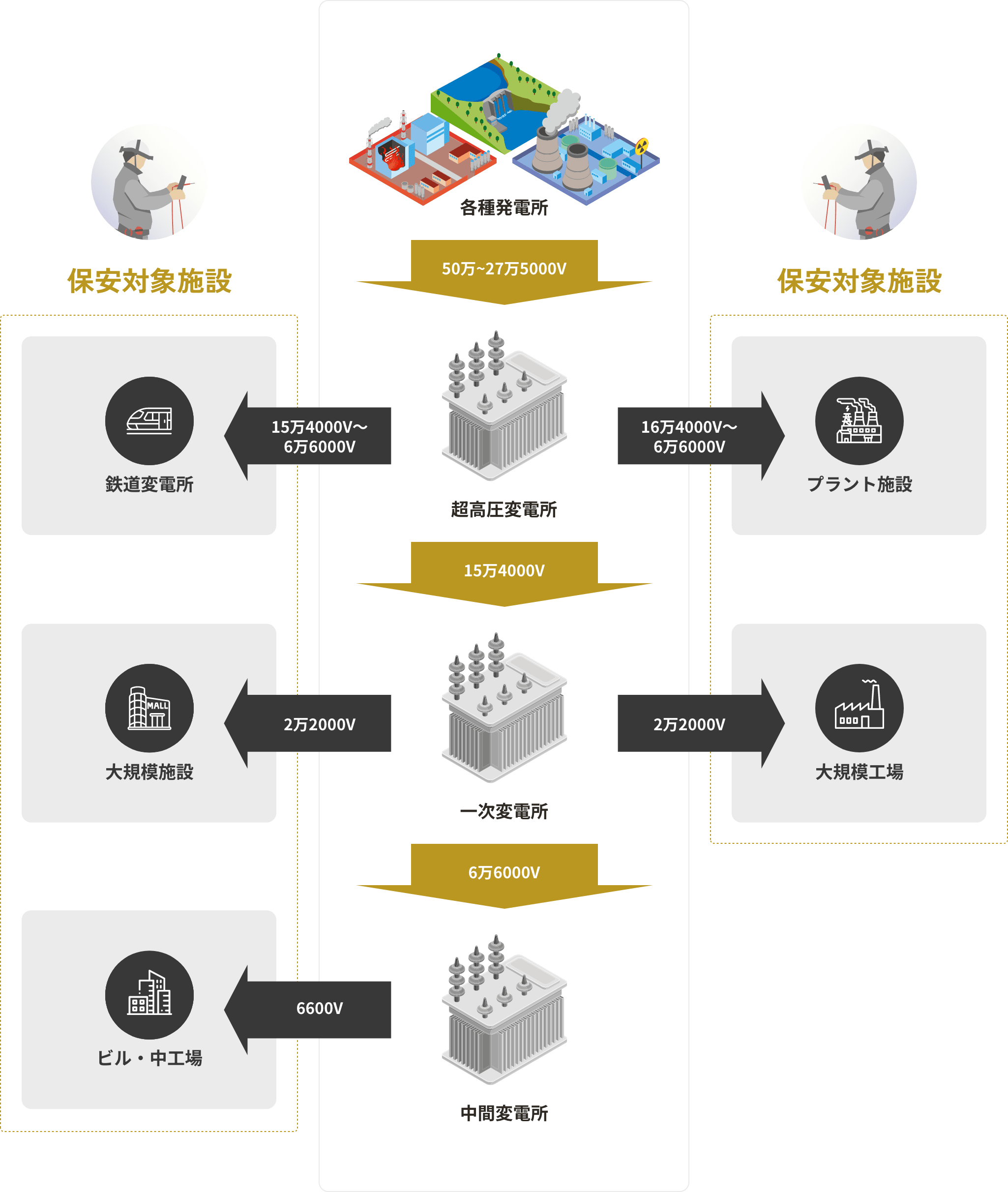 どの設備にも発電所から送られた電気を受け配電する「受変電設備」が設けられています。建物内への電気の安定供給のためには受配電設備の点検が欠かせません。電気の安定・安全な使用を実現するという社会的重要性からも、建物所有者は電気設備の点検を法的義務として課せられています。